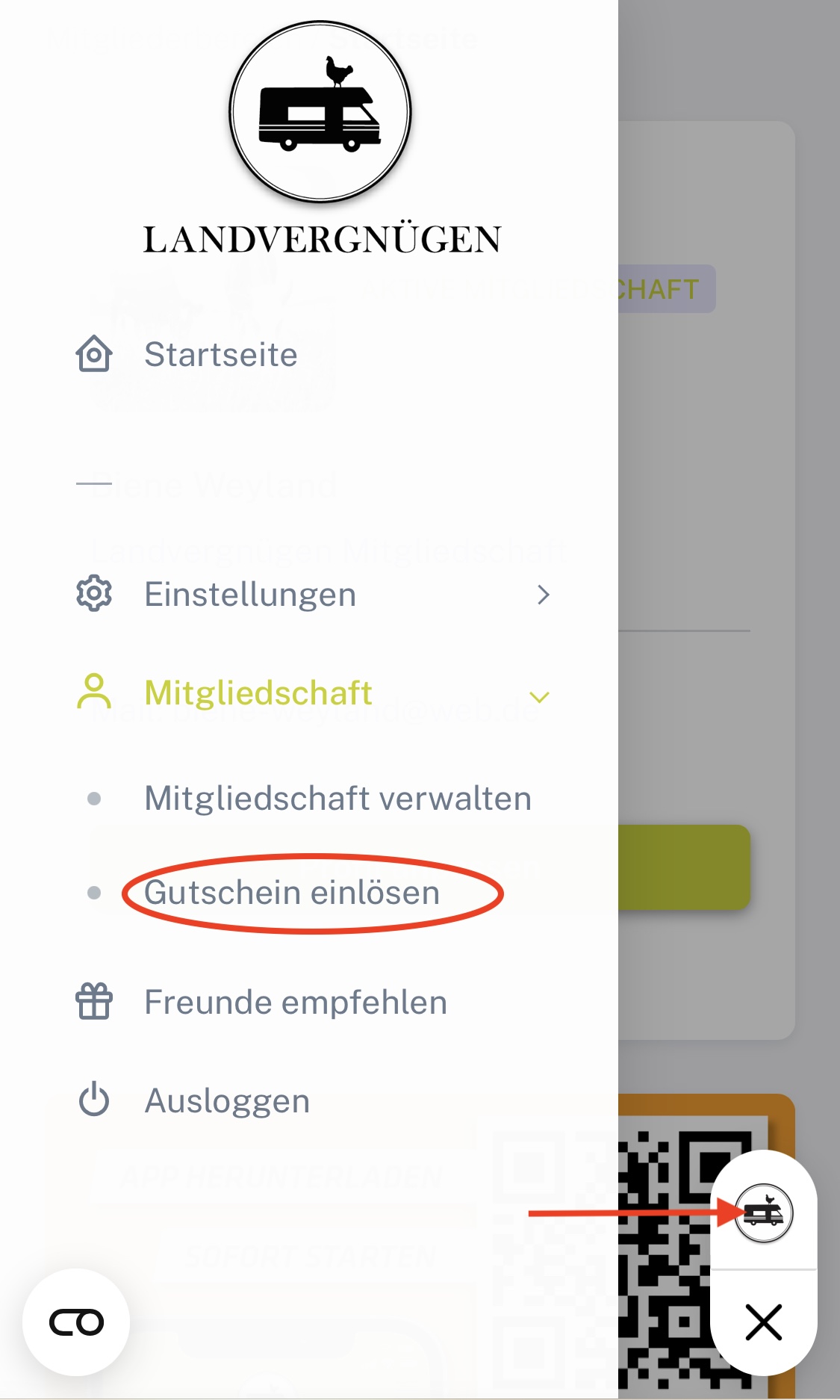 - Rechts unten findest du 3 Striche, wenn du darauf klickst, öffnet sich links ein Menu. Hier findest du unter "Mitgliedschaft" die Möglichkeit "Gutschein einlösen".