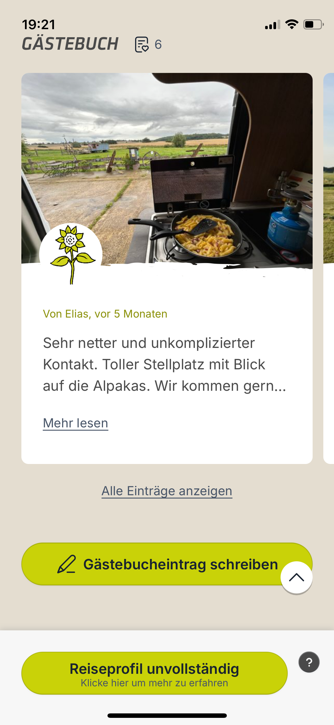 Um einen Gästebucheintrag zu verfassen, gehe in der Landvergnügen-App auf das Hofprofil des Gastgebers, über den der Gästebucheintrag verfasst werden soll. Scrolle nach unten, bis der grüne Button "Gästebucheintrag schreiben” erscheint, und klicke darauf.